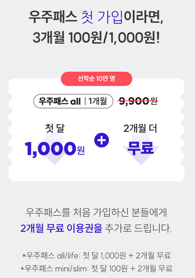 단, 해당 이벤트는 이번에 "첫 가입"이신 경우에만 해당 이벤트에 참여 가능합니다. 아직까지 우주패스에 가입을 한 번도 해보지 않으셨다면, 이번 행사 내용이 상당히 괜찮은 편이라 이용해보시는걸 추천드립니다!