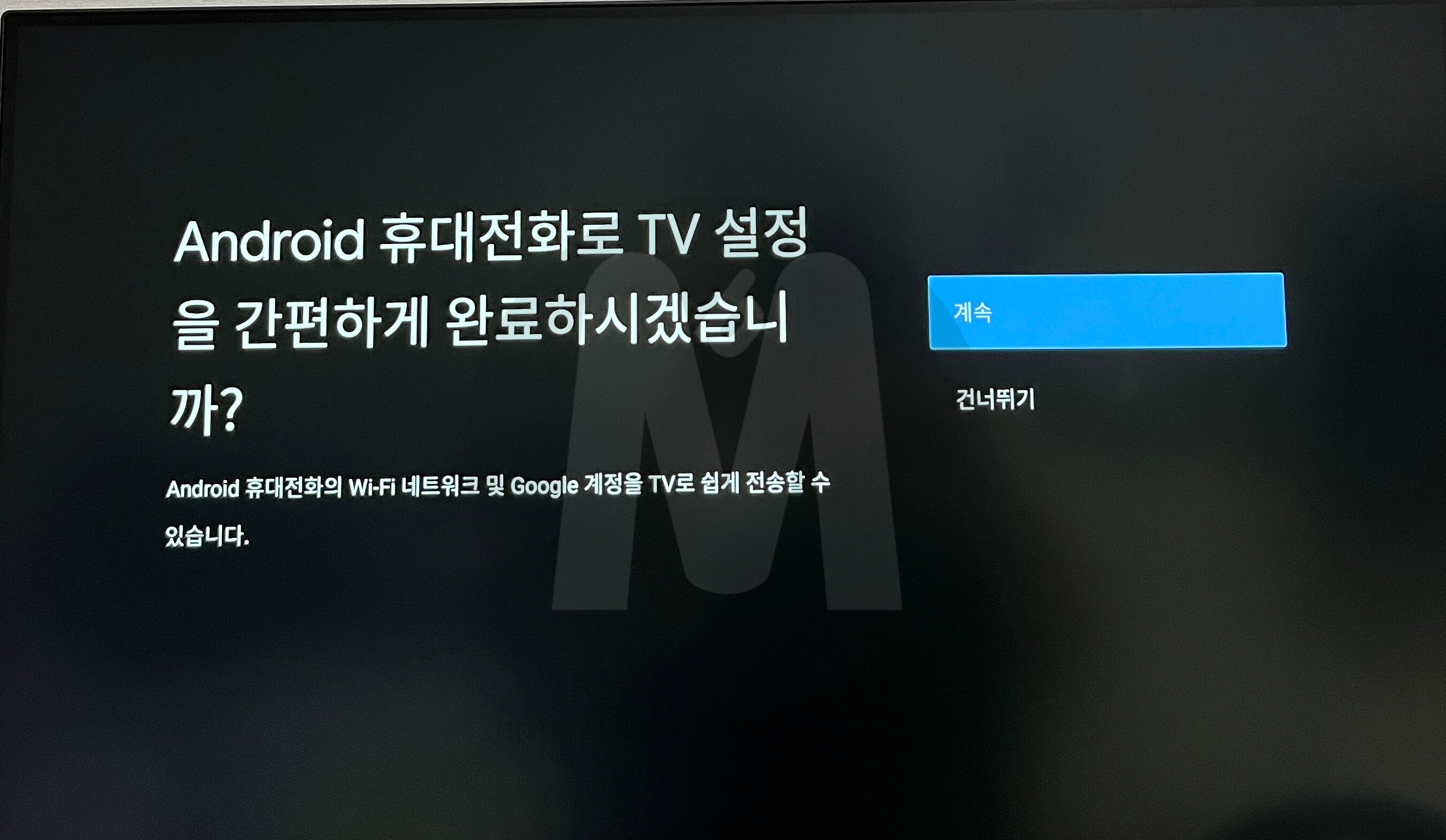 안드로이드폰으로 TV 설정을 진행할 수 있습니다. 안드로이드폰 유저시라면 계속 버튼을 눌러 폰에서 설정을 완료해주시면 되고 아니라면 건너뛰기 버튼을 눌러 리모컨을 조작하여 설정을 완료해주시면 됩니다.