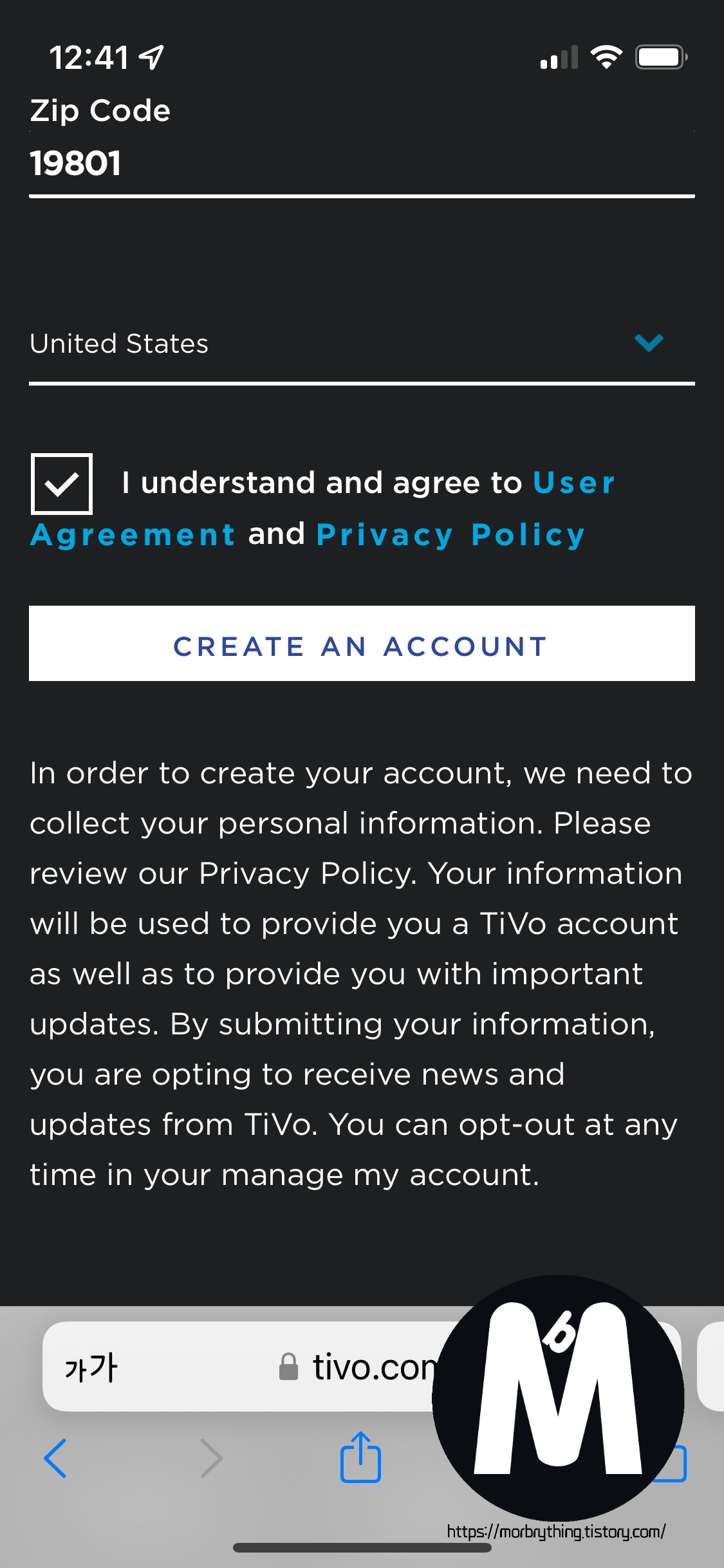 스마트폰을 이용하여 tivo.com/activate 페이지로 가서 페어링 코드를 입력한 다음, 티보 계정을 만들어 줍니다. 이때 티보 계정의 주소 정보가 반드시 미국내 지역으로 되어 있어야 합니다. 자신이 사용하는 미국 배대지 주소를 입력하시거나 인터넷에서 적당한 주소를 하나 찾아 입력해주면 됩니다.