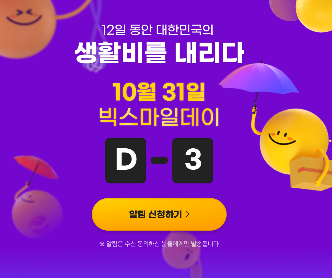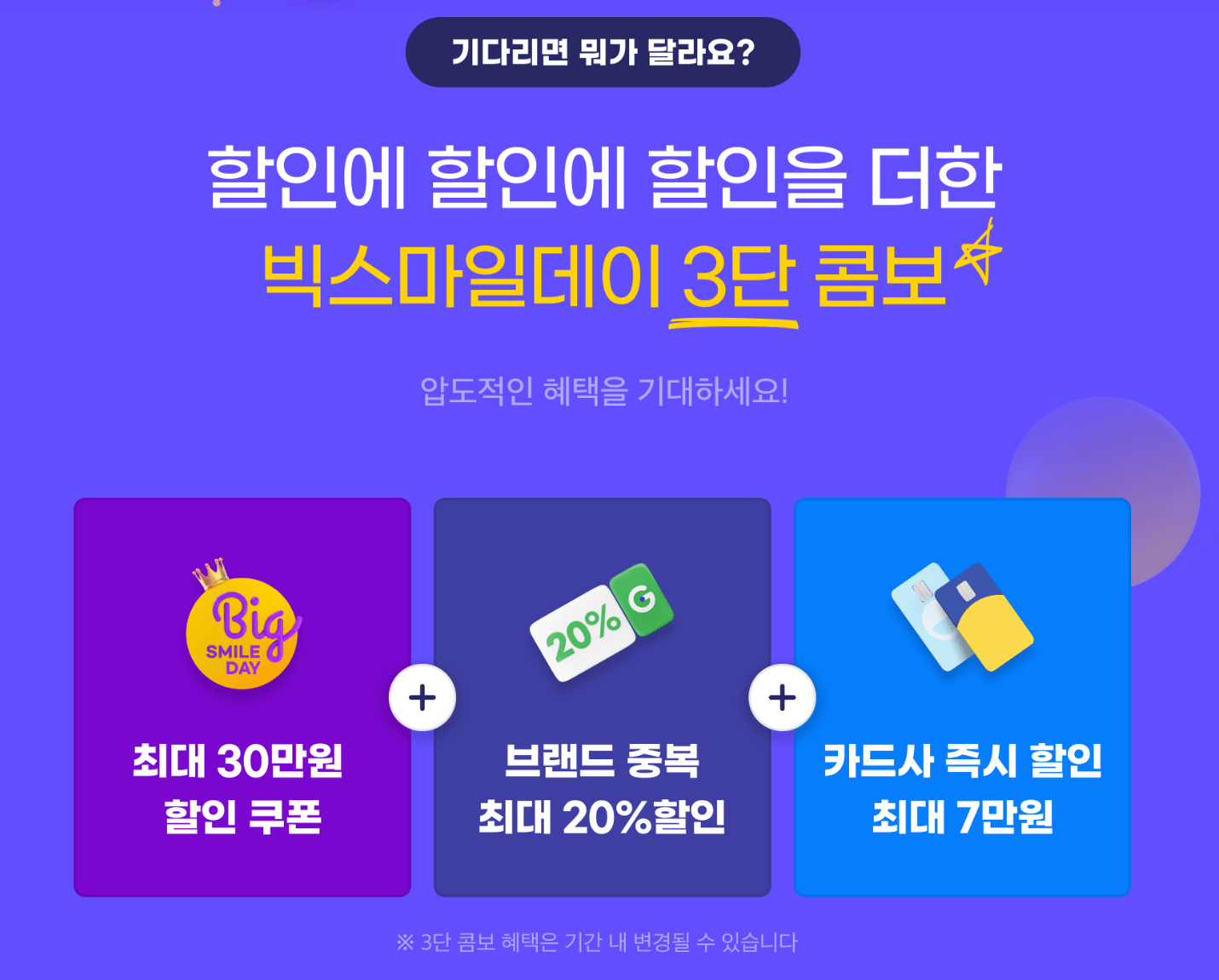 10월 31일부터 시작하는 빅스마일데이의 티저 페이지가 오픈했습니다. 행사 기간 동안 기본 최대 30만원 할인 쿠폰이 주어지며 별도로 중복으로 사용 가능한 브랜드 별 최대 20% 할인쿠폰이 제공된다고 합니다. 여기에 끝나지 않고 일부 카드사에 한해 최대 7만원 할인까지 제공할 예정이라고 하네요.