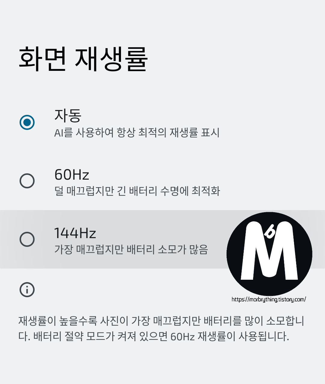 스펙에서 보셨다시피 엣지30은 최대 144Hz의 주사율을 지원합니다. 단 기본적으로 주사율 설정이 "자동"으로 되어 있어 90Hz~120Hz(주로 90Hz로 작동)로 작동되며, 설정앱에 있는 디스플레이 - 화면 재생률 설정에서 144Hz로 설정이 가능합니다. 고주사율이기 때문에 배터리 소모가 심한 편입니다.