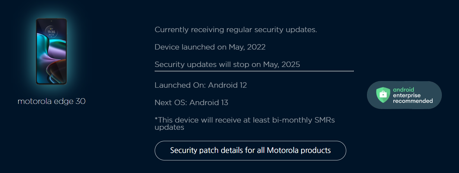 엣지30은 올해 8월에 정식 공개된 안드로이드 13에 대한 업데이트를 앞두고 있으며 모토로라 측에서 아직 정확한 업데이트 날짜를 고지하지 않은 상태입니다. 보안 업데이트의 경우 현재 시점에서는 8월까지만 업데이트 되어있으며 최소 격월로 진행될 수 있다고 하네요.