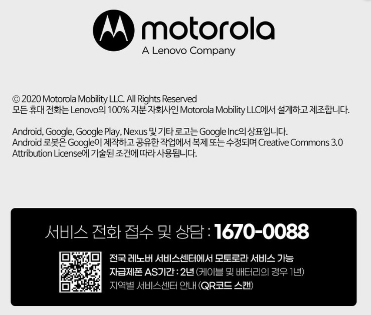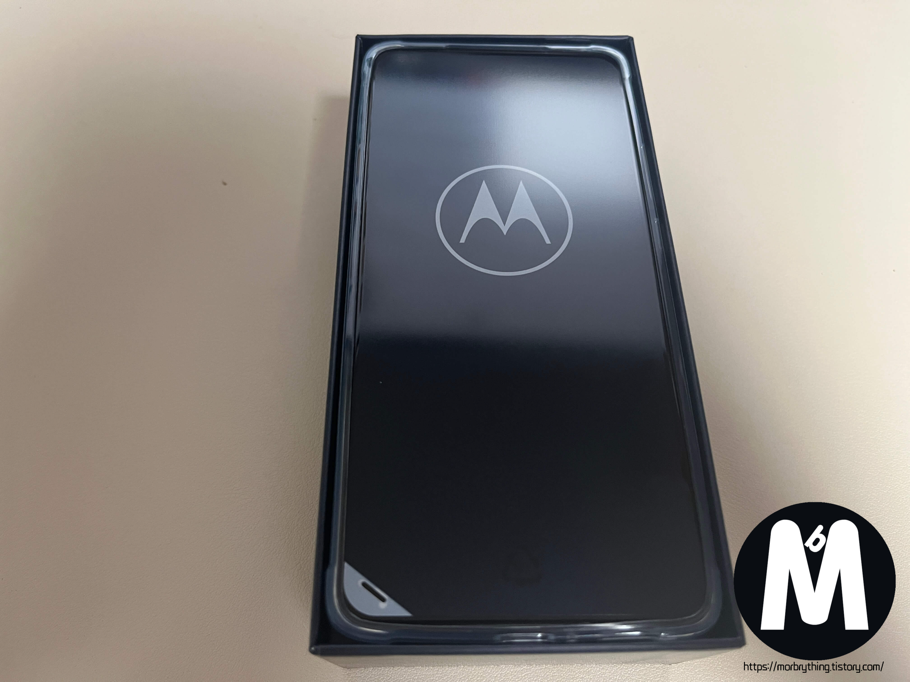 액정에는 액정 보호용으로 붙여둔 건지 친숙한 모토로라 로고가 그려진 스티커가 붙여져 있습니다. 왼쪽 하단에 있는 가이드 라벨을 통해 스티커를 제거해주면 됩니다.