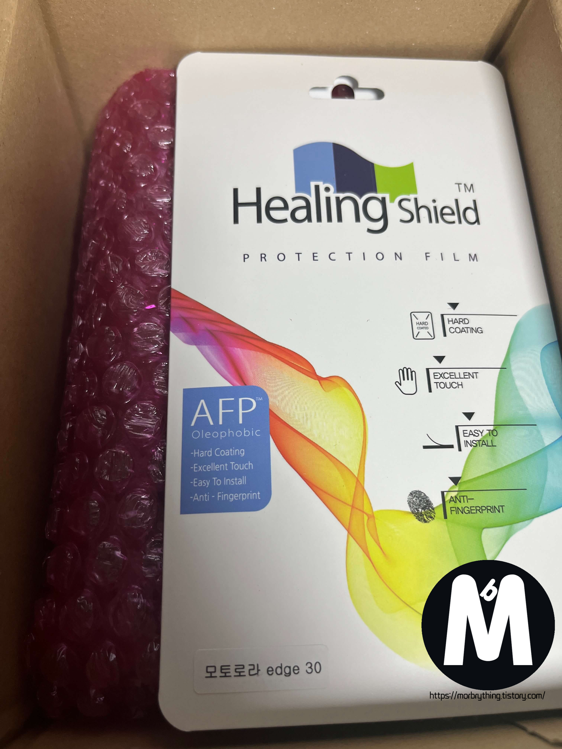 박스를 개봉하면 완충제에 담긴 엣지30 박스와 힐링쉴드 액정보호필름이 1매 들어 있습니다. 필름은 제조사에서 기본으로 주는 구성품이 아니라 쿠팡측에서 사은품(?)으로 제공해주는듯 합니다.