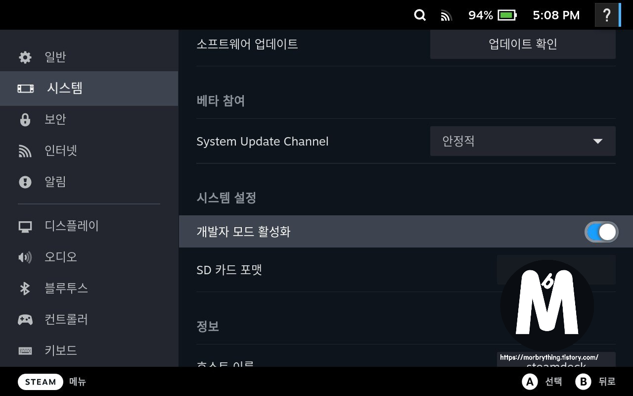스팀덱의 STEAM 버튼을 눌러 설정으로 들어간 뒤 시스템 항목에 있는 개발자 모드 활성화 버튼을 눌러줍니다.