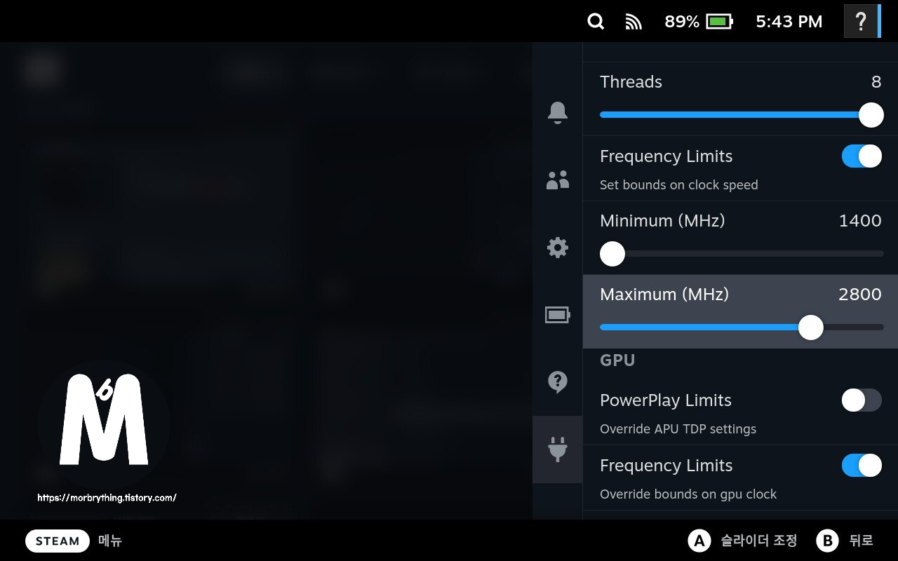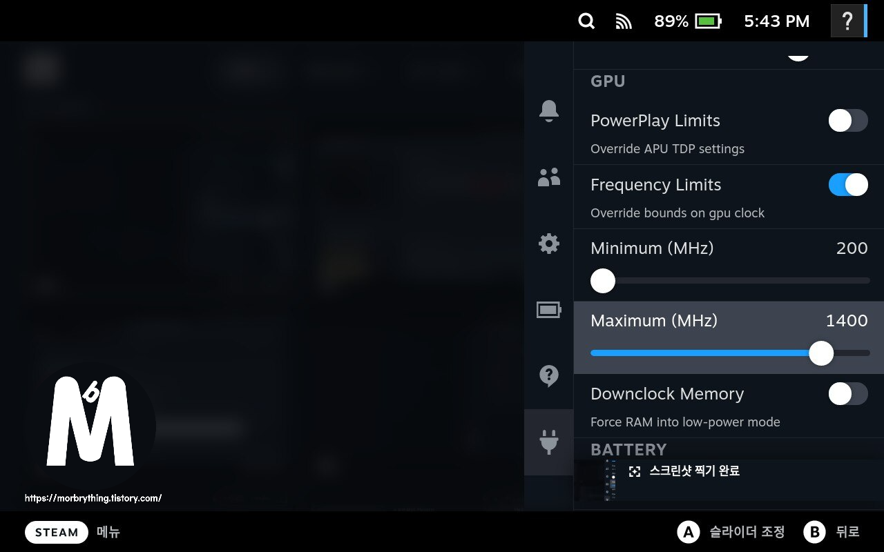 스팀덱의 CPU와 GPU관련 성능을 손쉽게 조절할 수 있게 해주는 플러그인 입니다. 활용방도로는 CPU와 GPU 클럭을 소위 얘기하는 전성비 구간까지만 언더클럭하여 배터리 타임을 더 늘림과 동시에 발열 문제를 다소 완화시킬 수 있고