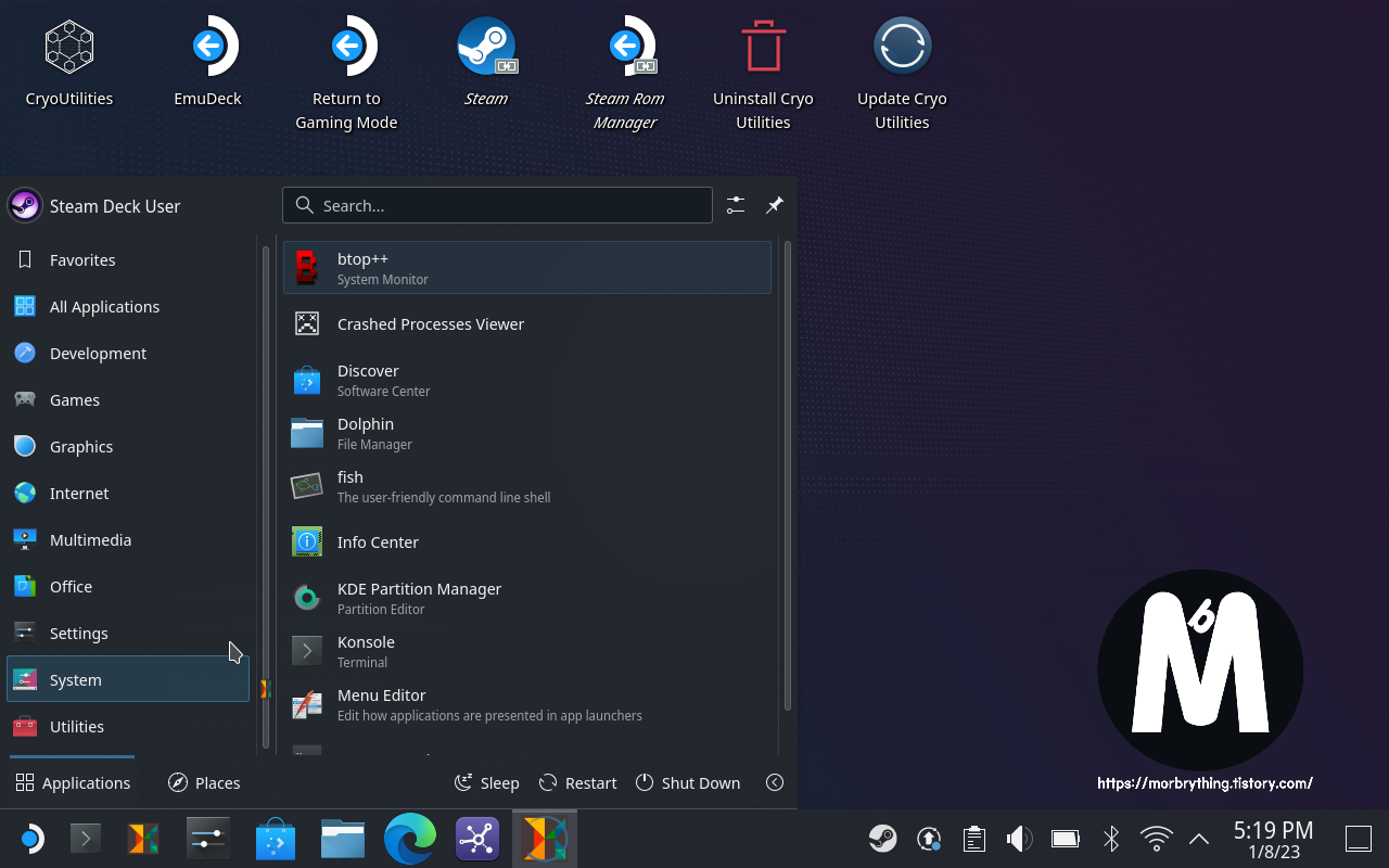 데스크톱 모드에 진입하여 시작 메뉴에서 System 항목에 있는 Konsole 앱을 실행시켜 줍니다.