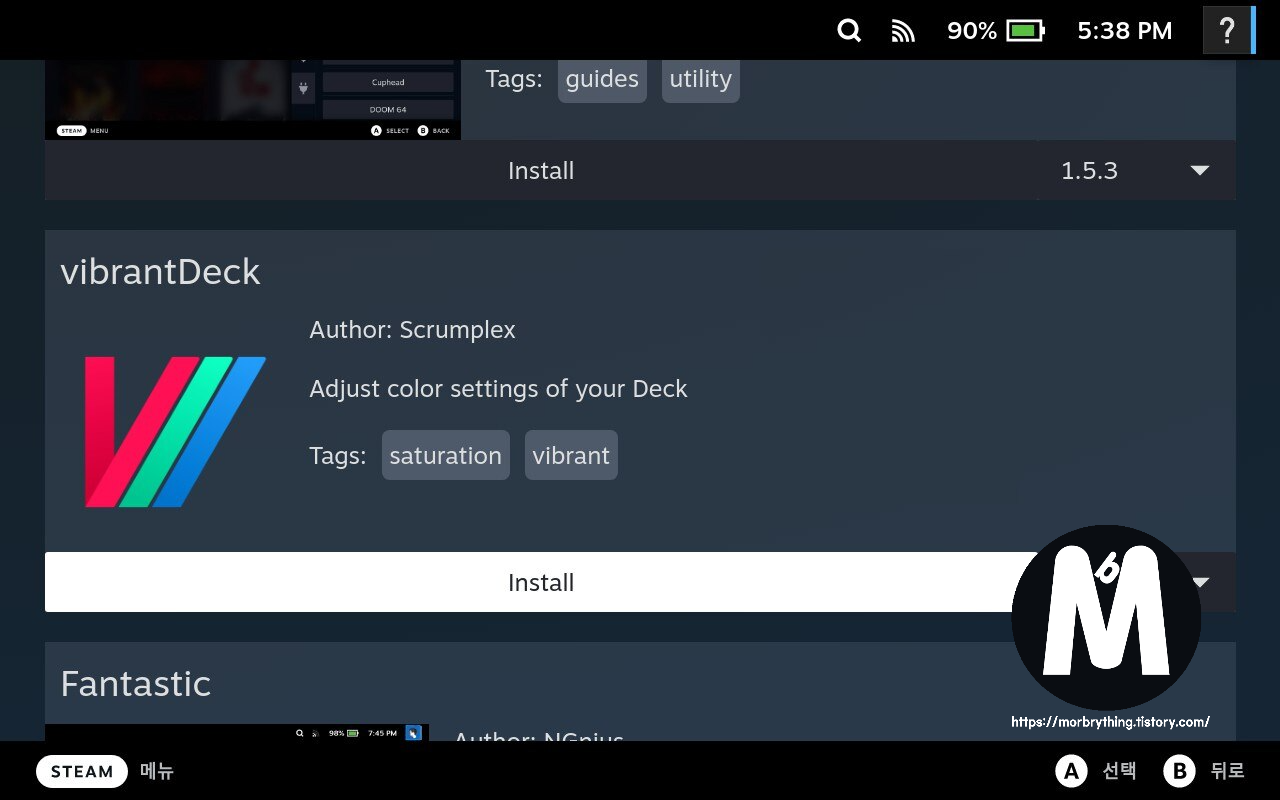 Decky Loader에서 상점 버튼을 눌러 VibrantDeck 항목으로 오신뒤 Install 버튼을 누르면 설치가 완료됩니다.
