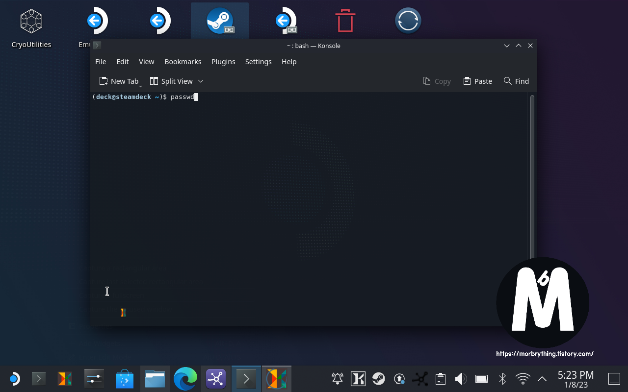 이미 하신 분들은 건너뛰셔도 되지만 sudo 패스워드를 생성하지 않으셨다면 Konsole 앱에서 passwd 커맨드를 입력하여 패스워드를 생성해줍니다.