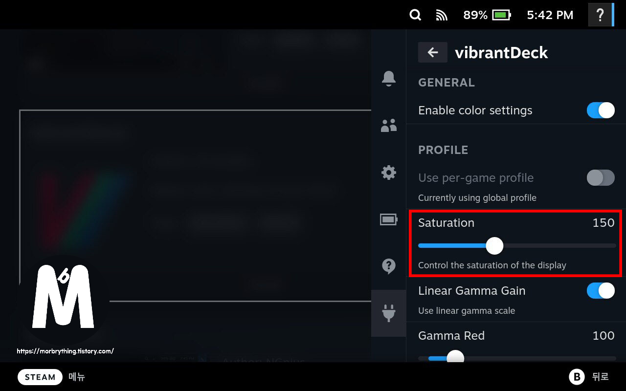 VibrantDeck은 채도값, 감마값 등 스팀덱의 디스플레이 색상 영역 수치를 조절할 수 있도록 해줍니다. 스팀덱 화면 색감이 물빠진것 같다 하시는 분들은 이 플러그인을 설치하여 채도값을 조절해주시면 되는데요.