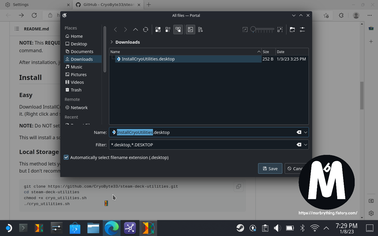 스팀덱 데스크톱 모드로 진입하셔서 브라우저를 통해 위의 깃허브 주소로 들어가줍니다. 해당 깃허브 본문에 있는 Install 항목에 있는 this file 링크를 우클릭하고 Save as로 파일을 저장해주면 바탕화면에 바로 CryoUtilities 스크립트가 생성됩니다.