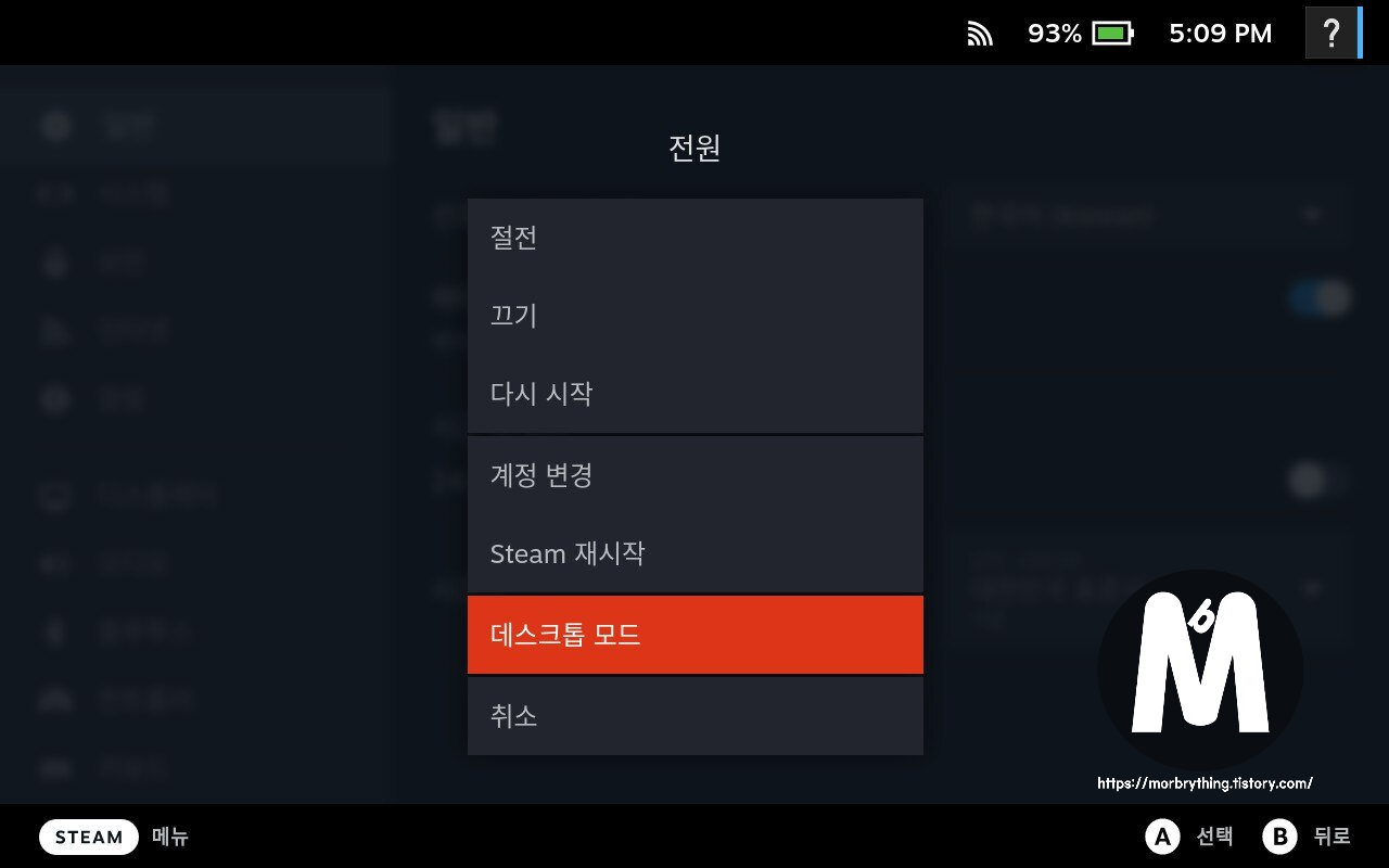 STEAM 메뉴 또는 스팀덱의 전원 버튼을 꾸욱 누르면 뜨는 전원 메뉴를 통해 데스크톱 모드로 진입합니다. 여기서부터는 무선이든 유선이든 키보드를 연결하는게 편합니다. (좀 불편하지만 STEAM 버튼 + X버튼으로 가상 키보드를 사용하셔도 됩니다)