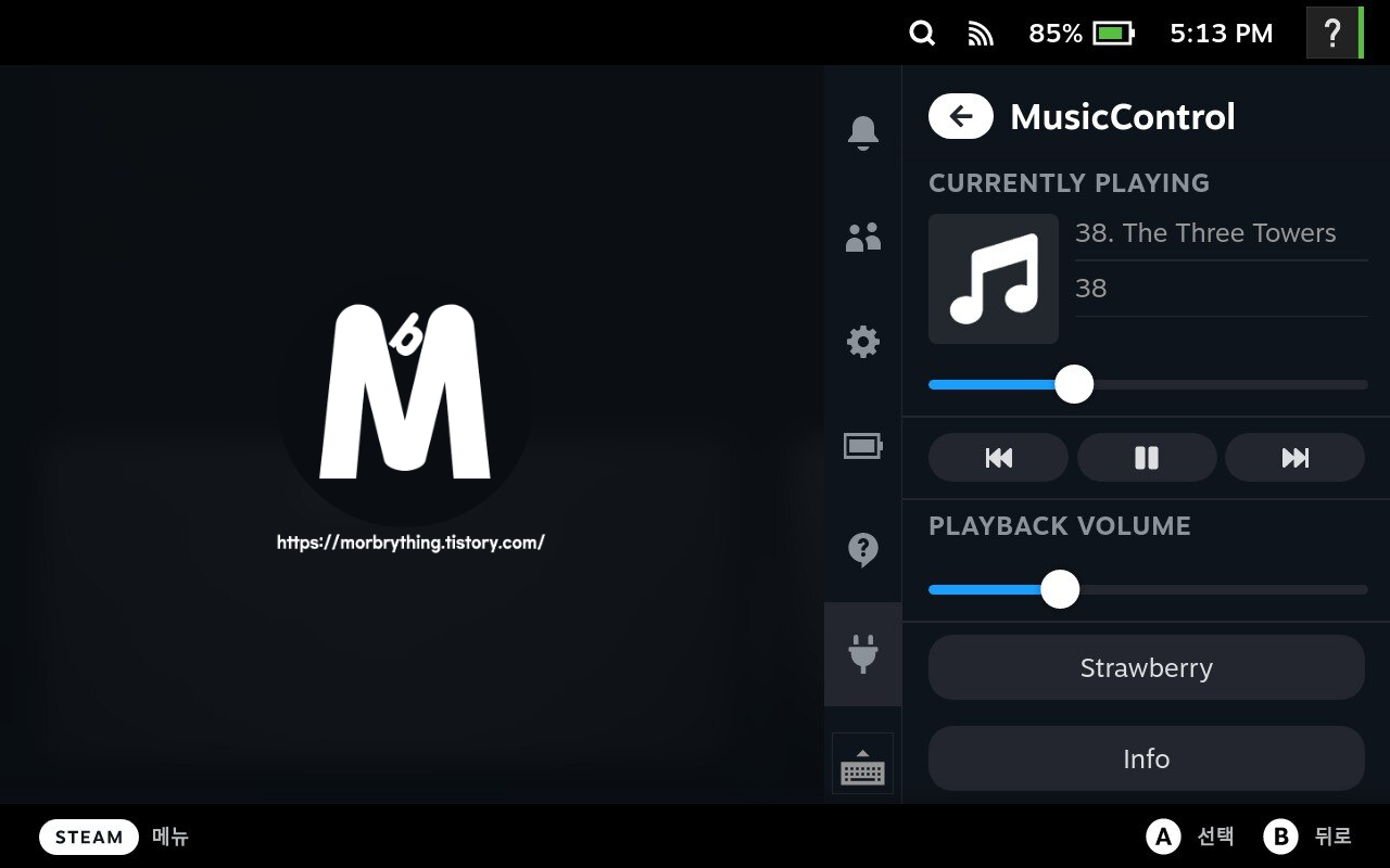 이럴 때 사용하기 좋은 MusicControl 이라는 플러그인이 있습니다. 굳이 전환하지 않고 스팀덱의 간편 메뉴를 통해 다음 곡 넘기거나 음악을 멈추거나 하는 등 제어가 가능합니다.