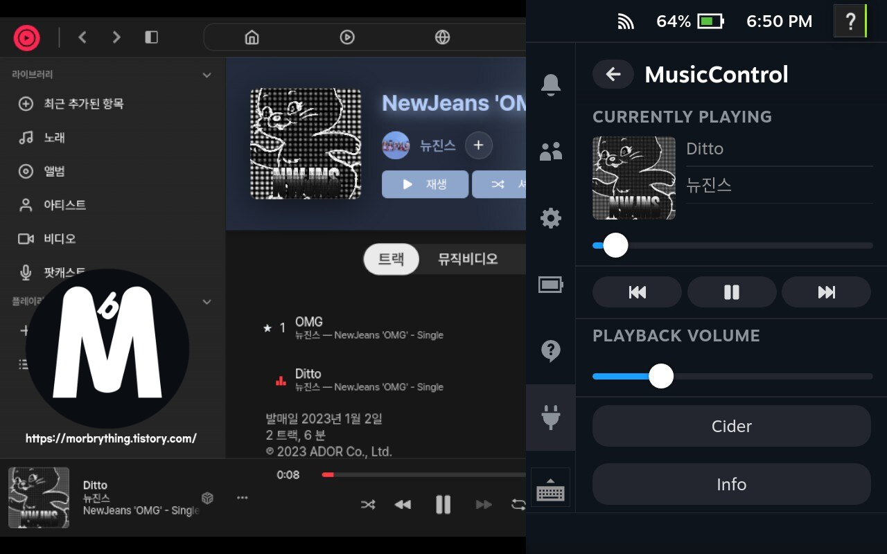 Cider 앱을 실행해서 음악을 재생하면 MusicControl 플러그인에서 이를 인식하여 제어할 수 있습니다. 👍