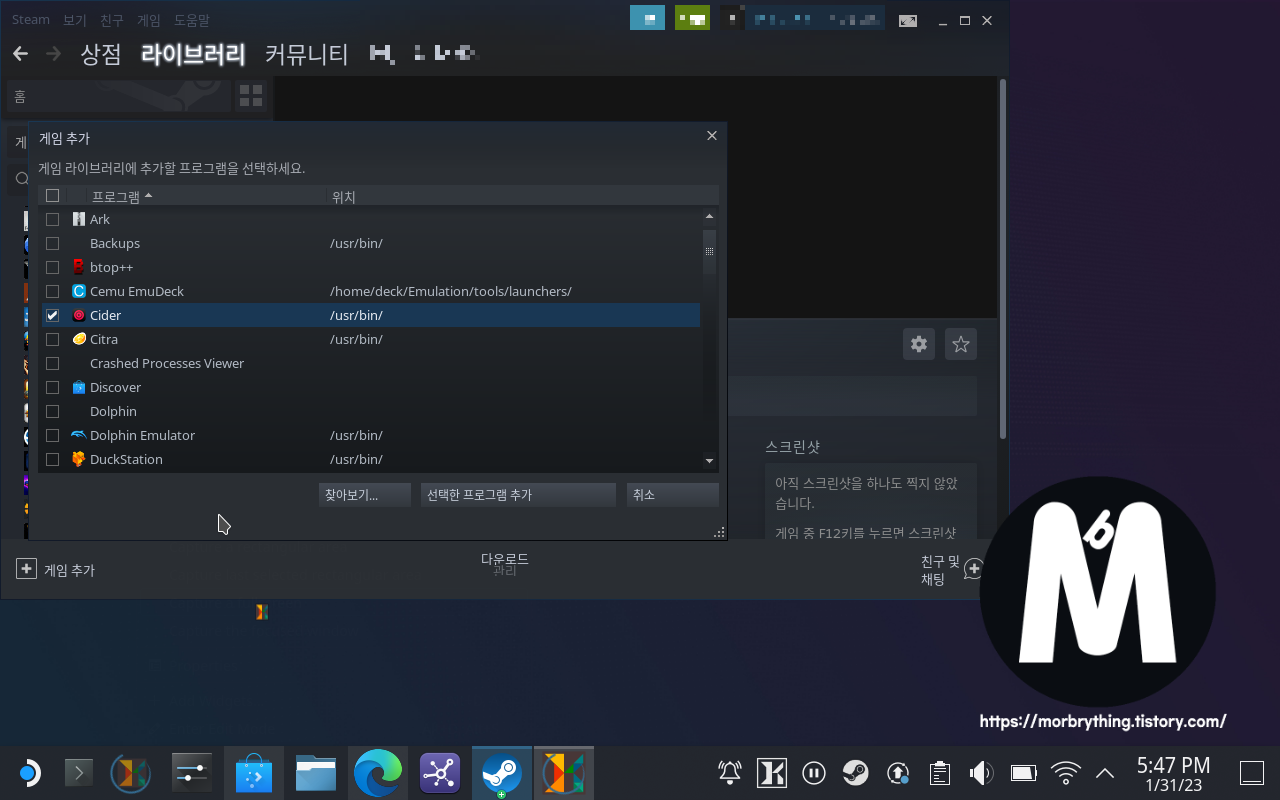 설정을 다 마치셨다면 프로그램 종료 후, 게이밍 모드에서 사용하기 위해 사진과 같이 데스크톱 스팀 프로그램 - 라이브러리 항목에서 비 Steam 게임 추가 버튼을 통해 Cider 앱을 추가해줍니다.