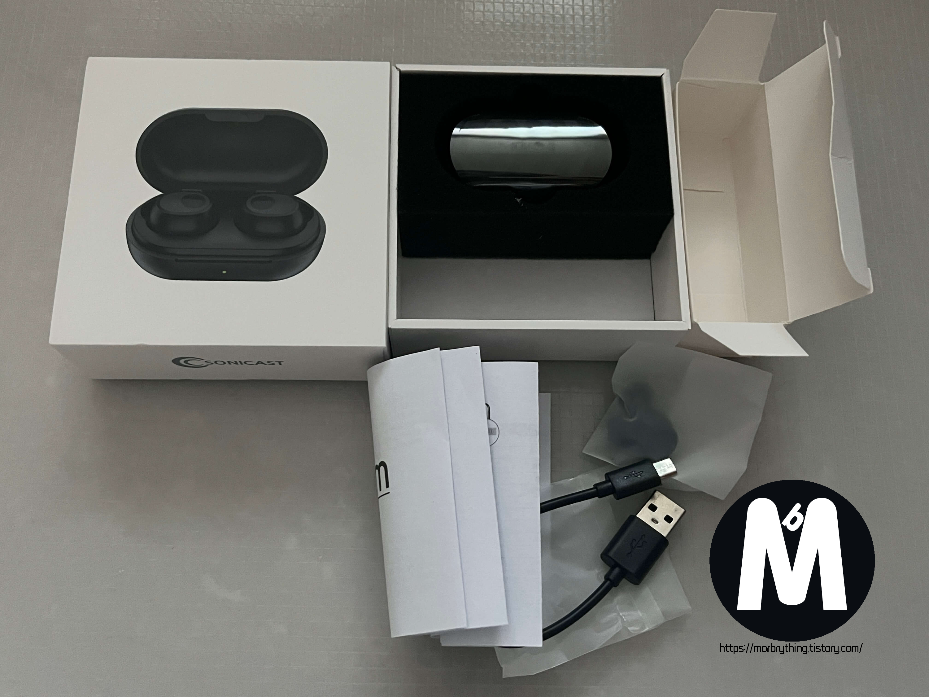 부속품으로 제품 설명서와 30cm USB 충전 케이블(5핀), 여분의 S/L 사이즈 이어팁이 들어있습니다.