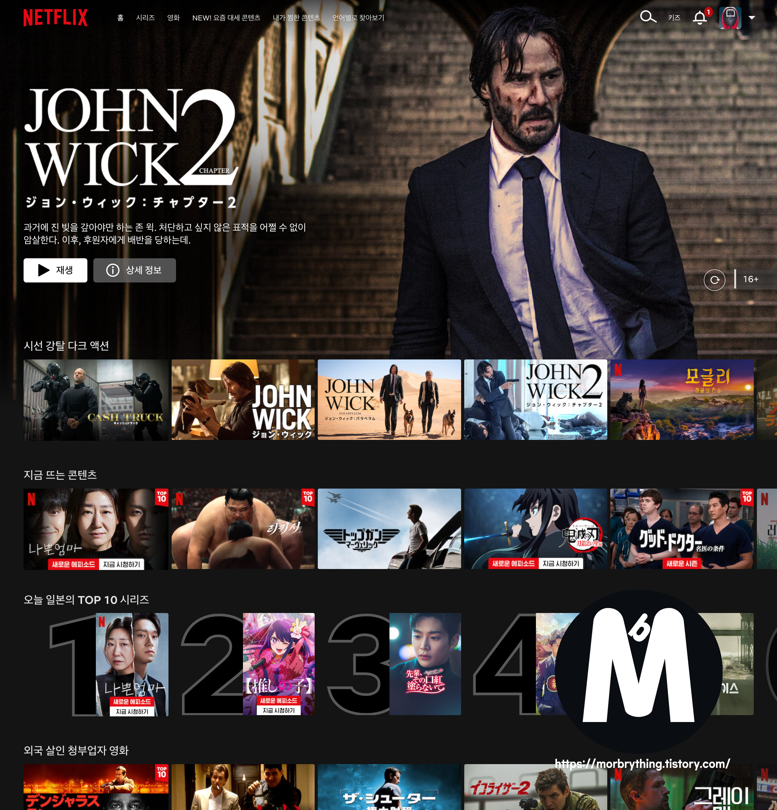 그 후, 넷플릭스에 접속하면 위와 같이 일본 넷플릭스에 접속된걸 확인할 수 있습니다. 분명 일본 넷플릭스에 접속 했지만 넷플릭스측에서 사용자 정보를 읽고 컨텐츠 소개 정보나 제목들을 사용자 국가의 언어로 출력해주기 때문에 불편한 점 하나없이 이용 가능합니다 👍