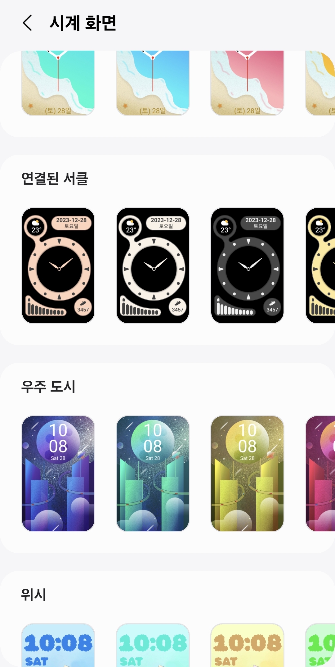 갤럭시 웨어러블 어플에 있는 워치페이스는 꽤 다양합니다. 각 테마별로, 색상 별로 많고 스크롤 한참 내려야 할 정도로 즐비한데 뭔가 또 그렇게 예쁜게 많은것 같지는 않습니다. 커스텀 워치페이스를 지원해주거나 추후 업데이트때 추가되었으면 좋겠네요.