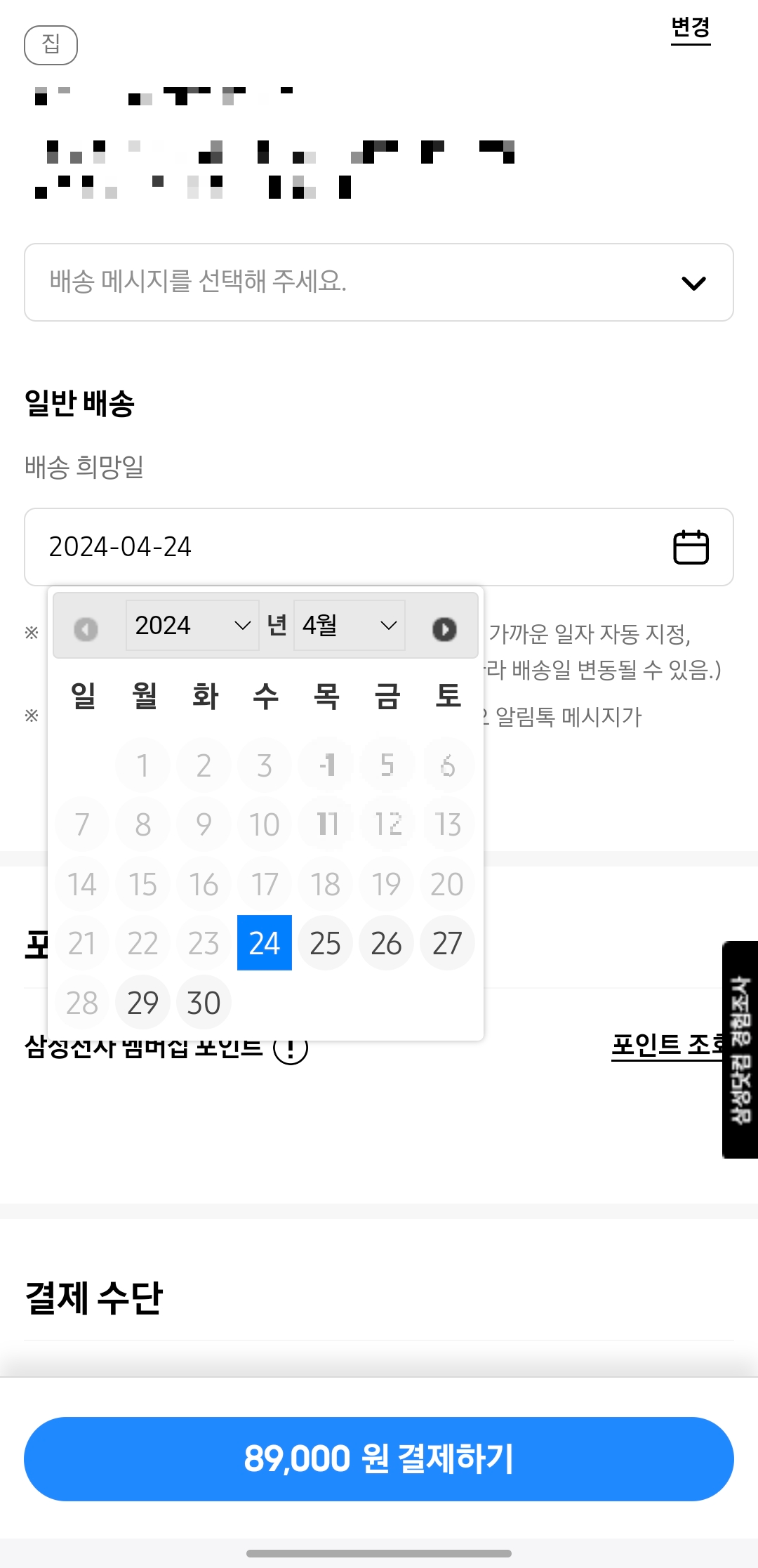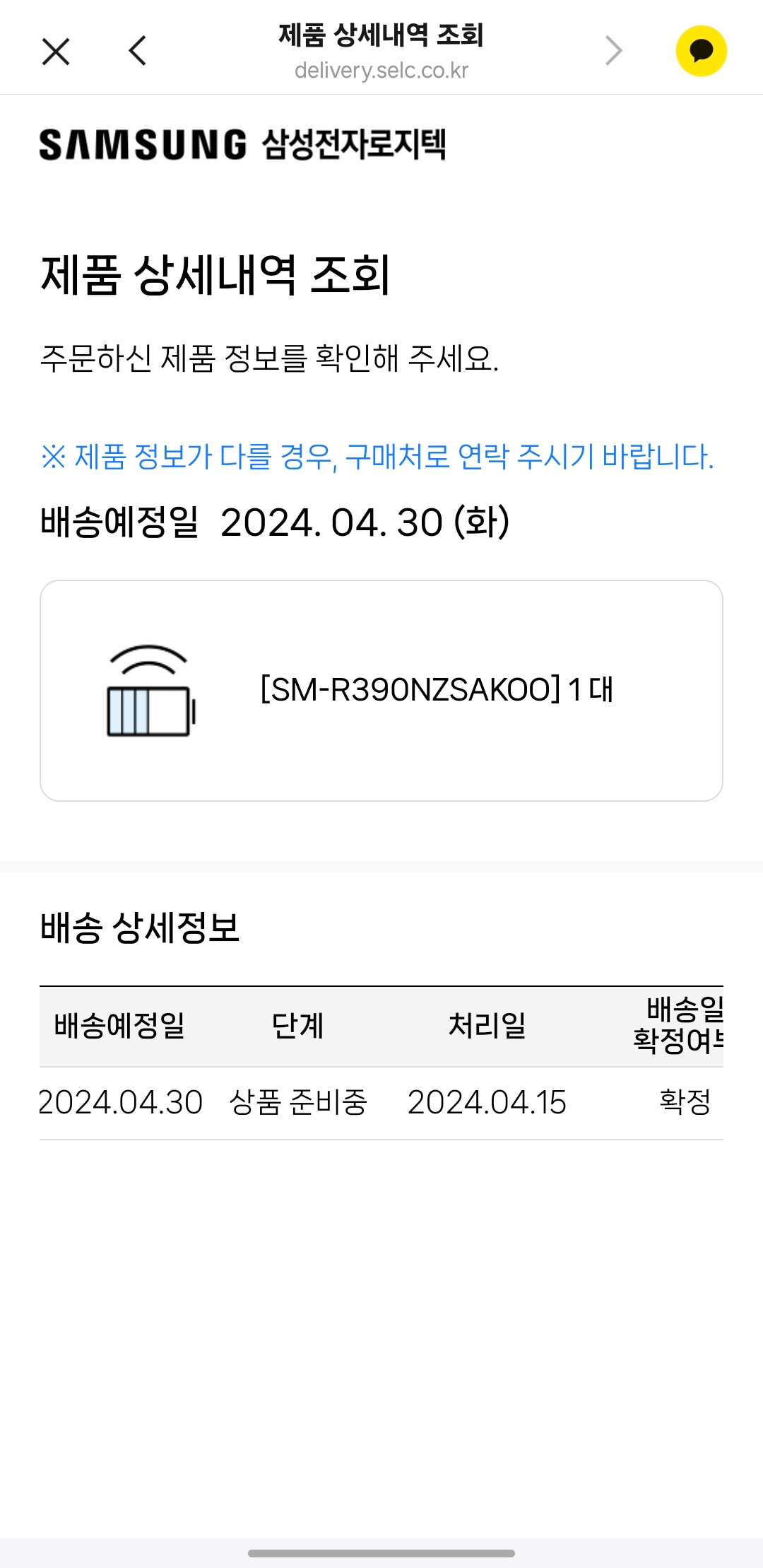구매한 다음 삼성전자로지텍에서 배송에 대한 카톡이 도착했고 배송예정일이 4월 30일이라고 떠서 당황했으나..