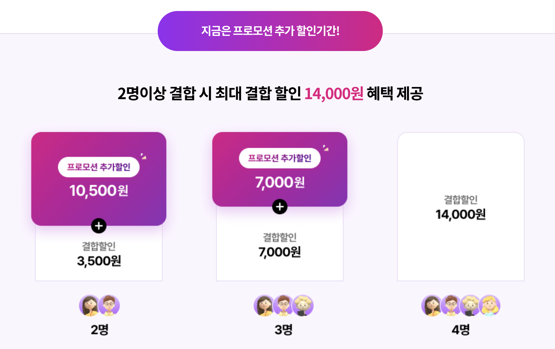 3. κ²°ν© μΈμ μ΅λ 4λͺ μΌλ‘ μ΅λ 14,000μ ν μΈ (νμ¬ μ΄λ²€νΈλ‘ 2λͺ λ§ λͺ¨μλ 14,000μ ν μΈ)