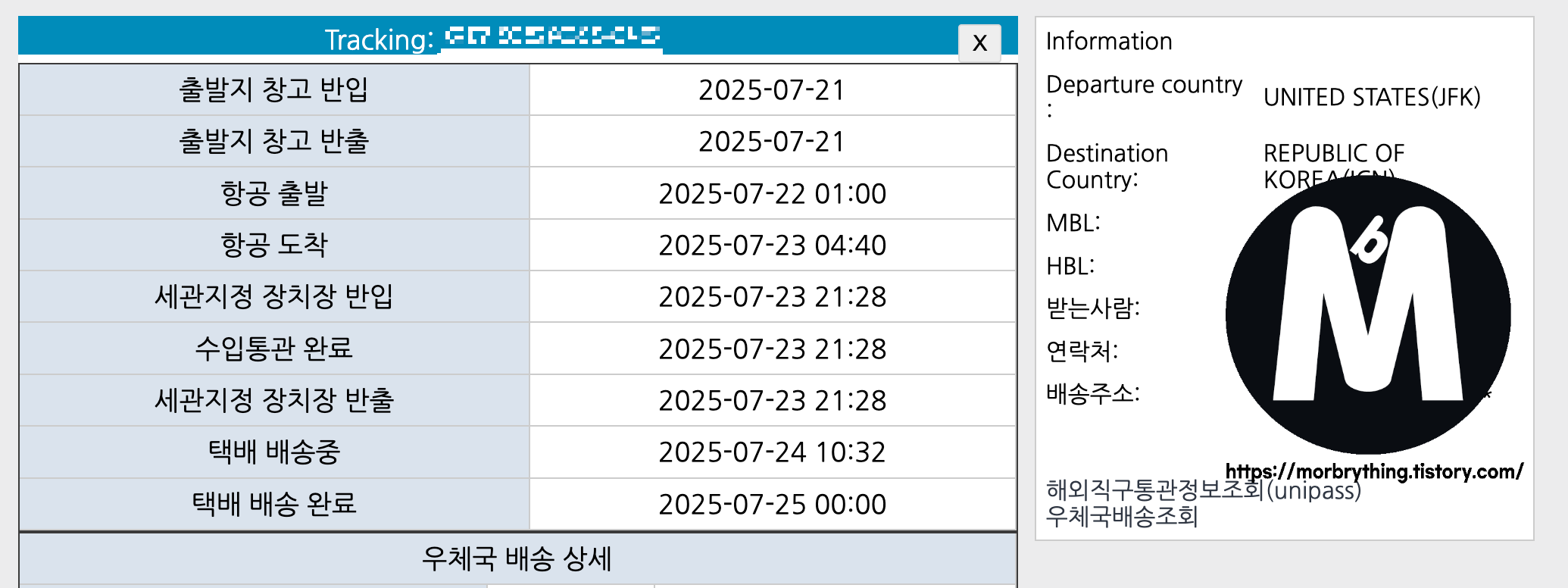 7월 22일 미국에서 배송 출발 -> 7월 23일 한국 세관 도착 -> 7월 24일 통관 완료 및 배송 시작 -> 7월 25일 도착