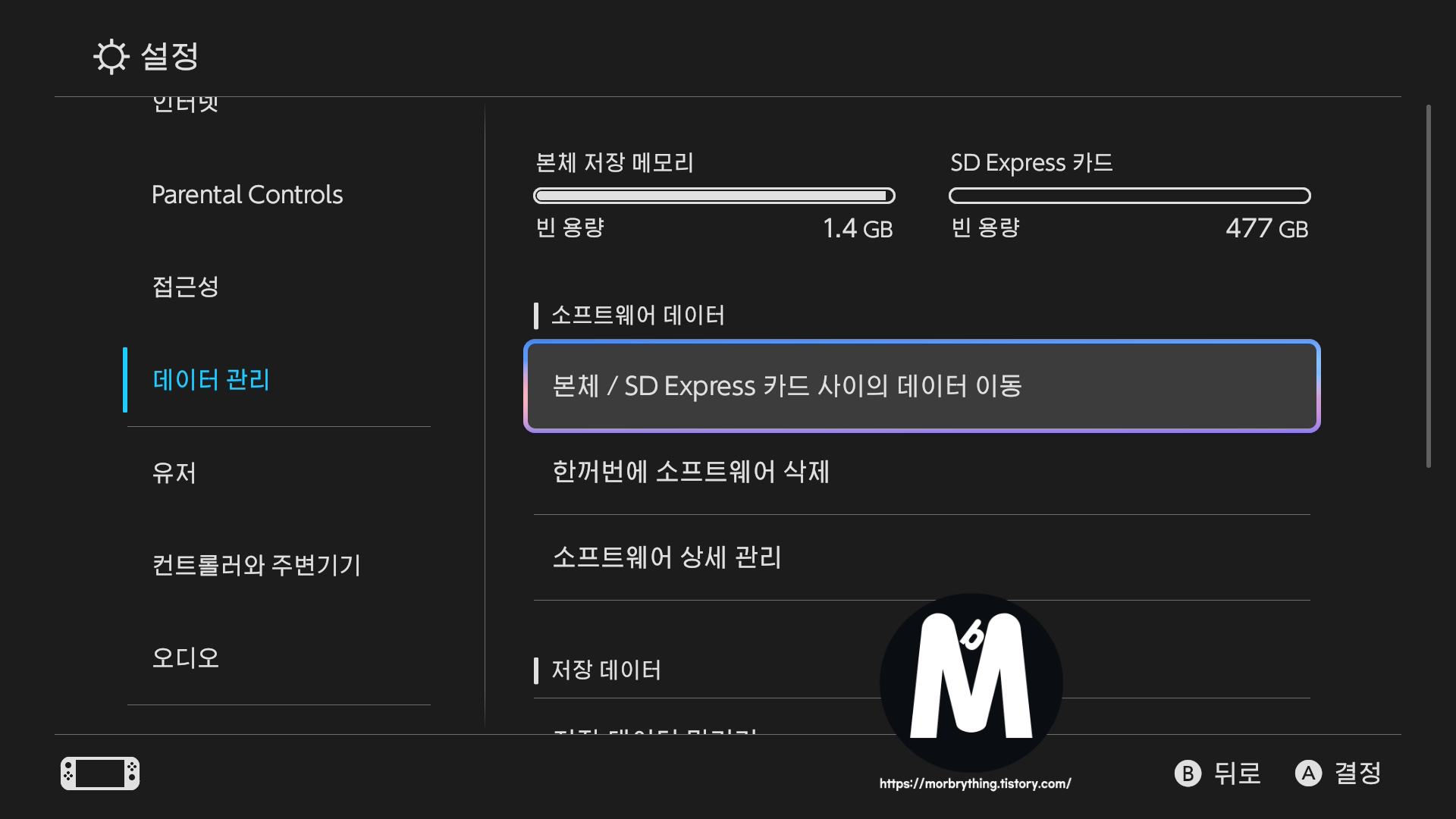 삽입 전, 데이터 백업을 해야하는데 저는 가지고 있는 SD 익스프레스용 리더기가 없어서 그냥 스위치2 본체에서 해결했습니다. SD카드에 있던 게임은 일단 본체 용량 되는대로 최대한 많이 본체 저장소로 옮겨주었고 사진/영상도 본체 저장소로 옮겨주었습니다.