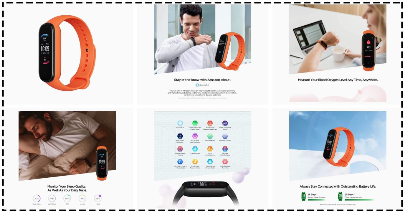 이런 상황에서 아마존 상품 페이지에 어메이즈핏 밴드5가 나타났습니다. 아직 판매중인 상품이 아니라서 그런지 상품 페이지는 대략적인 부분만 올라와 있는 느낌이 들지만 상품 페이지를 살펴본 결과, 어메이즈핏 밴드5는 역시 미밴드5와 유사한 디자인 및 기능을 담고 있으며 눈에 띄는 차별점은 어메이즈핏 밴드6와 동일하게 알렉사 기능과 산소포화도 기능이 들어갔다는 점입니다. (Always on Display 기능도 들어가 있다고 하는데 설명 이미지에는 해당 언급이 없어서 지켜봐야 할 것 같습니다)