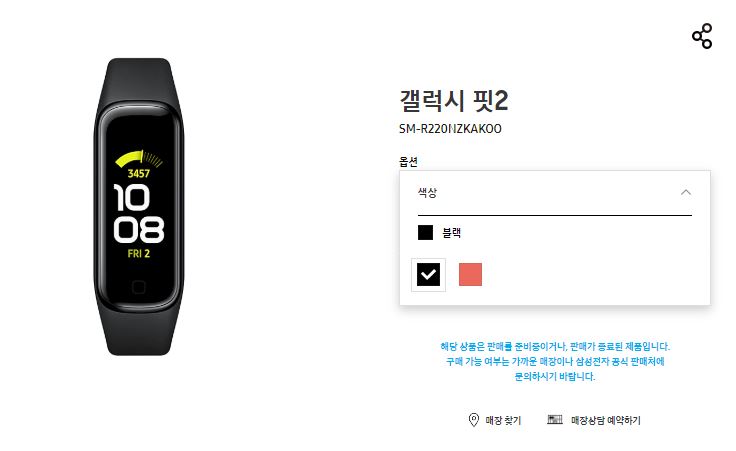 판매 목록에 밴드 색상은 스칼렛 색상과 블랙 색상 두가지가 올라와 있는데 이 중 블랙 색상만 현재 판매하고 있습니다. 이전작인 갤럭시 핏이 초저가형을 노린 갤럭시 핏e와 같이 출시되었었기 때문에, 이번에도 갤럭시 핏e2가 발표될까 싶었지만 결국 갤럭시 핏e2는 없는것 같습니다.