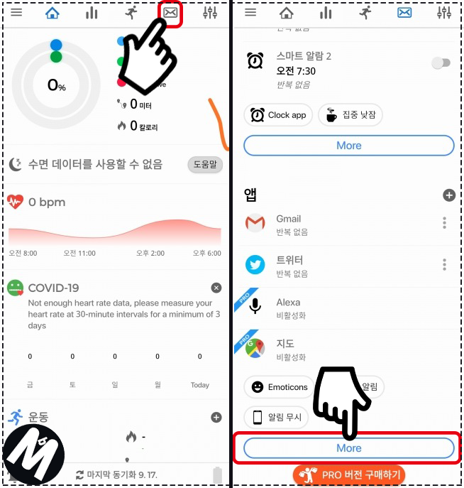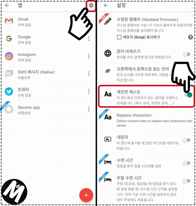 깨끗한 텍스트 기능 해제관련 글은 사실 지금 올리기엔 너무 늦었지만 ㅠ 간간히 질문에 올라와서 따로 포스팅해서 작성해봅니다. 미밴드5 한글폰트를 사용하시는 유저분들중 한글 알림에서 글자가 깨져나오는 분들은 Nofity & Fitness for Miband 앱(이하 노티파이앱) 에서 깨끗한 텍스트 기능을 꺼주시면 해결됩니다.