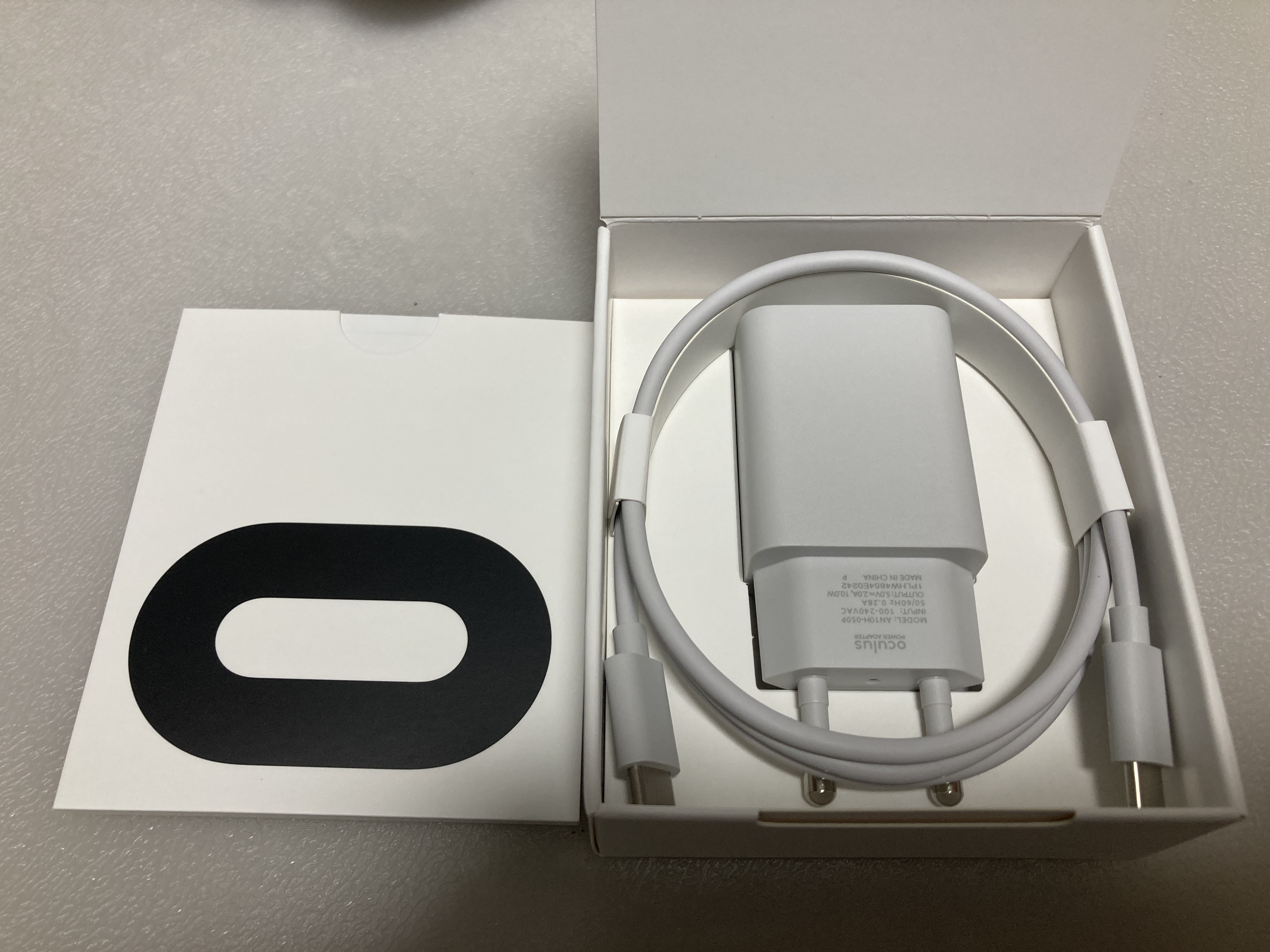 패키지 속 본체 위에 있는 작은 박스입니다. 여기에는 보증서와 설명서 그리고 USB-C타입 케이블과 10W 충전기가 들어있습니다. 실제로 오큘러스 퀘스트2는 정품 충전기가 아닌 기타 PD 충전기를 사용해도 충전시 대부분 10W로 충전됩니다. 요건 개인적으로 사용할 일은 없을것 같아서 개봉하지 않고 다시 넣어두었습니다