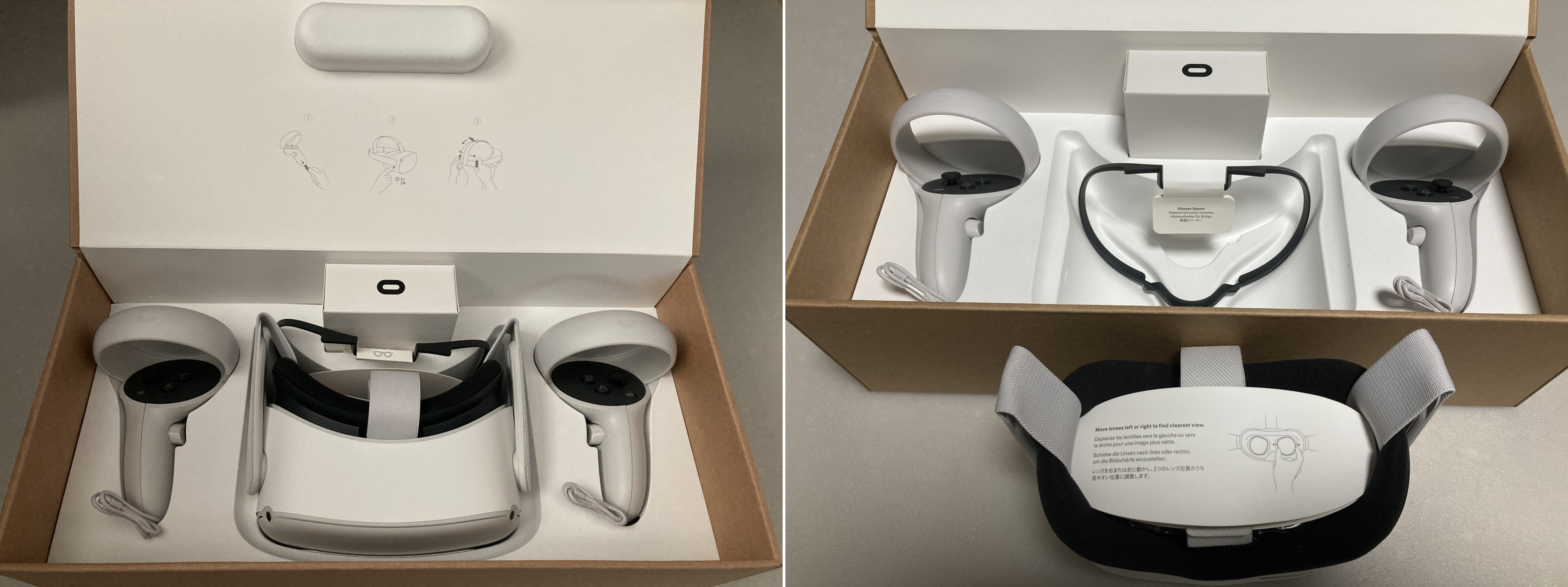 퀘스트2 본체에는 안내사항이 적힌 종이와 안경 가이드가 들어있습니다.