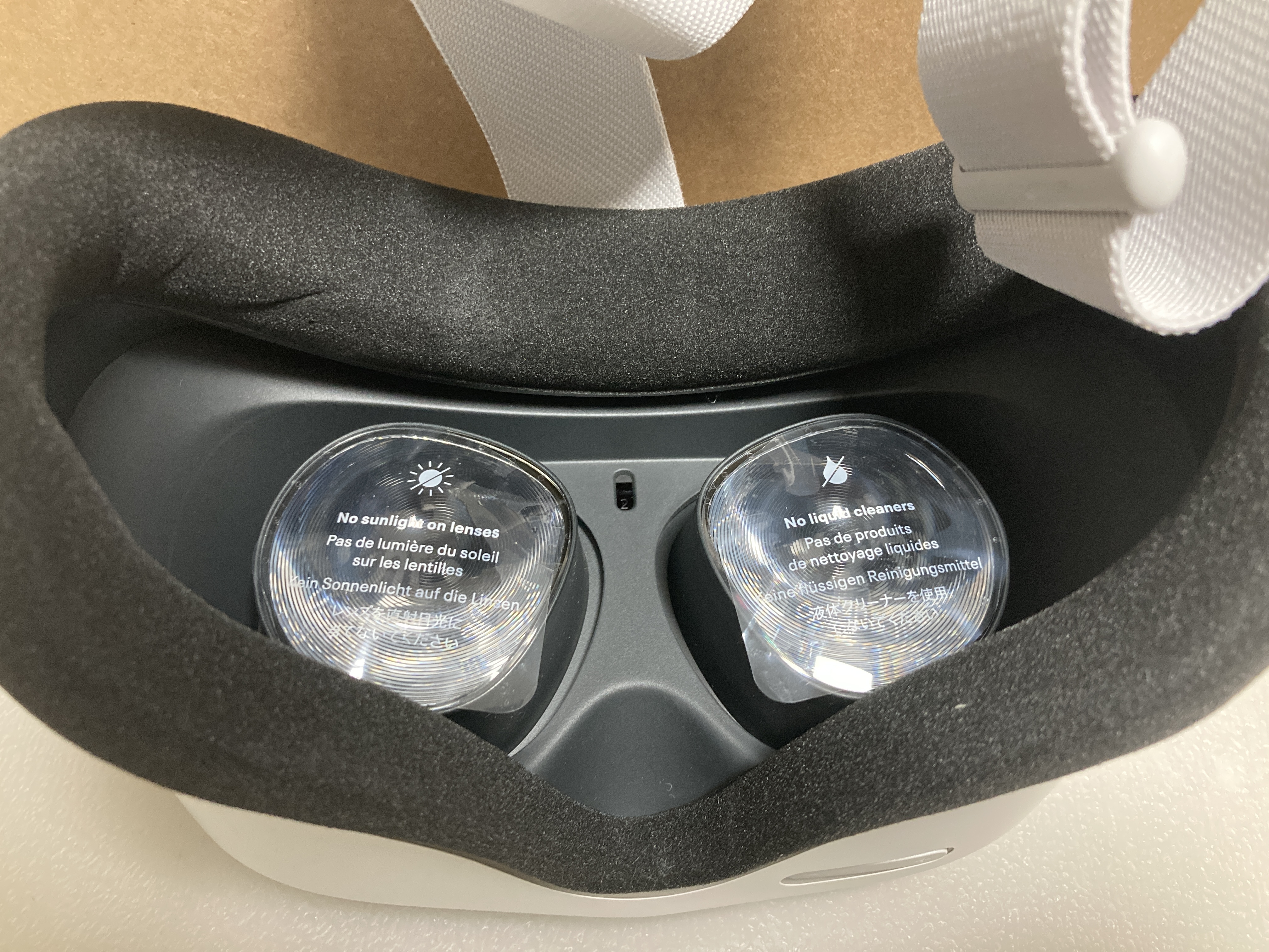퀘스트2 렌즈 겉에 붙어있는 직사광선을 조심하라는 문구가 적힌 비닐입니다.