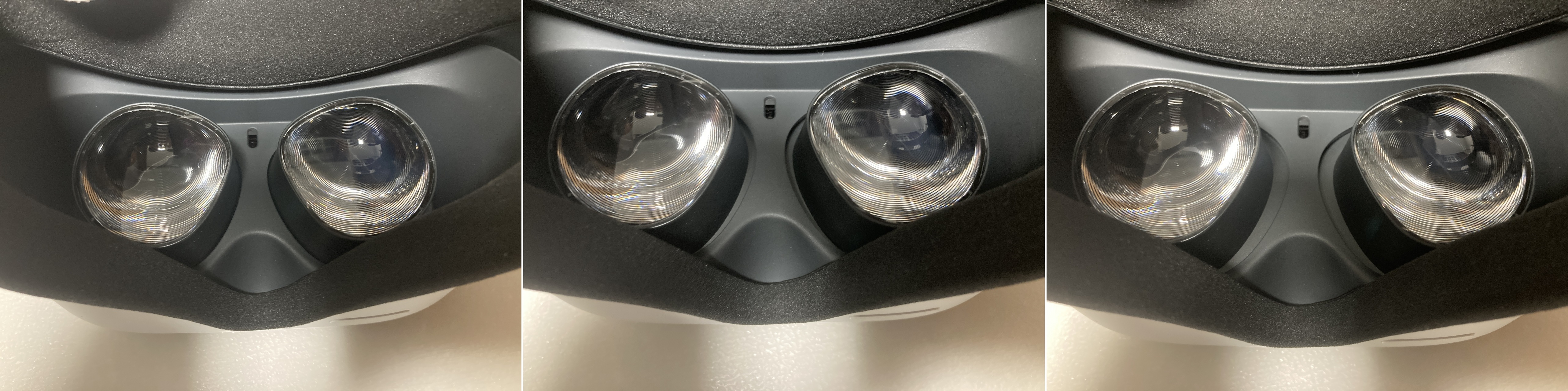 퀘스트1에서는 좌측 하단에 다이얼이 달려있어서 세세하게 조절이 가능했는데 퀘스트2에서는 단가절감을 위해서였는지 58/63/68mm 3가지 단계만 지원합니다. 위의 사진을 보시면 간격 차이를 보실 수 있고 렌즈 사이에 있는 작은 구멍을 통해 현재의 IPD 단계를 알 수 있게 해놓았습니다.