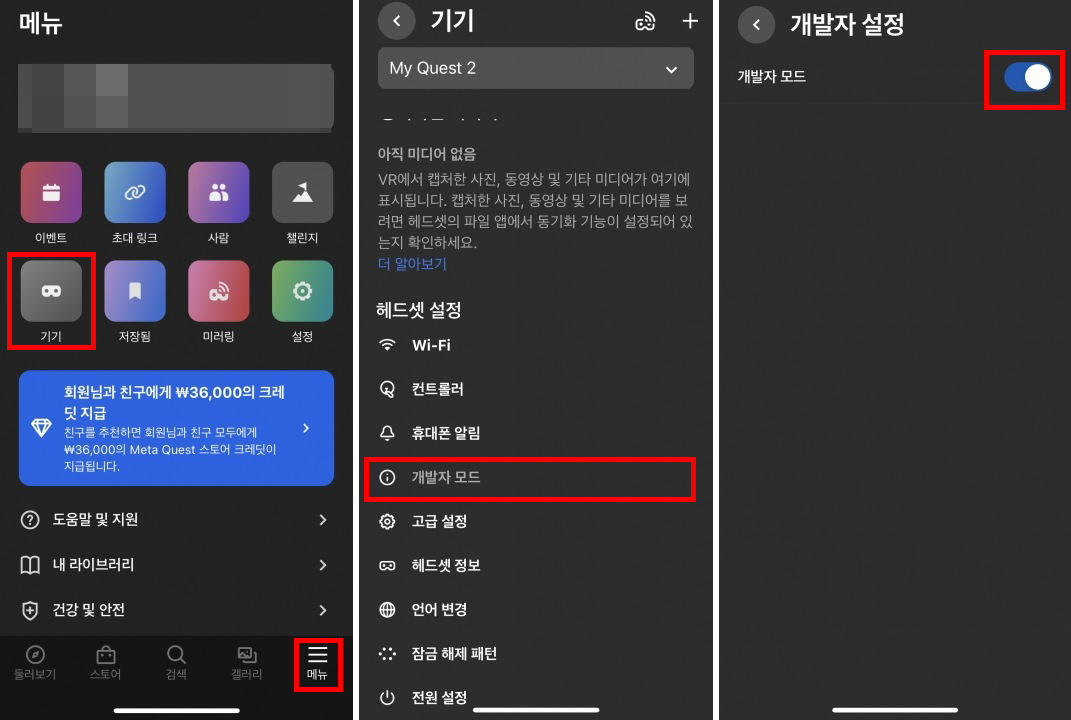 개발자 등록이 완료되셨다면 자신의 스마트폰에 있는 오큘러스 앱에 들어가셔서 퀘스트2 본체와 앱을 연결시퀸 뒤 사진과 같이 설정하시면 개발자 모드 활성화가 완료됩니다. 이후 퀘스트2를 한번 재부팅해줍니다.