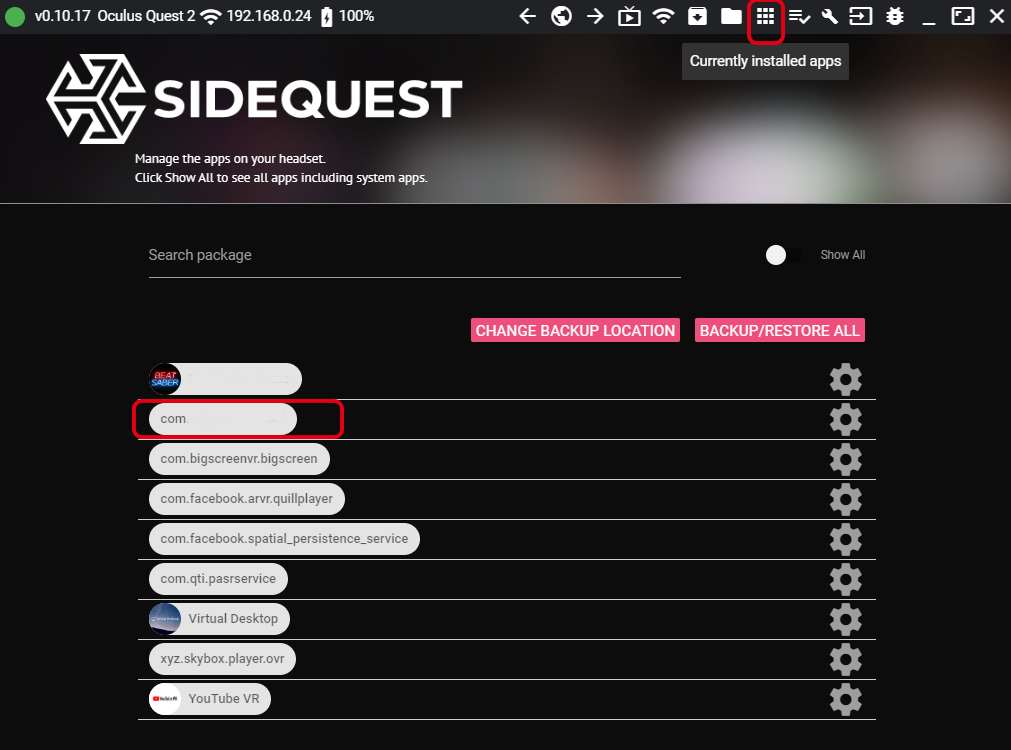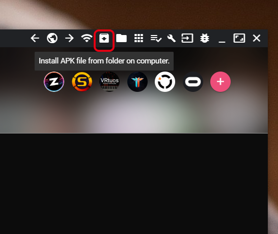 사이드퀘스트 우측상단 메뉴를 보시면 빨간 테두리친 아이콘이 보이실겁니다. 해당 아이콘을 클릭하게 되면 불러오기 창 하나가 뜨는데 거기에서 설치할 apk파일을 지정해주시면 사이드퀘스트에서 바로 설치가 진행됩니다.