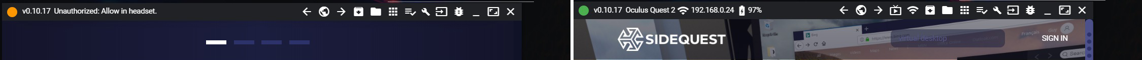 USB 디버깅이 활성화 되었으면 사이드퀘스트 프로그램 상단좌측에 초록불이 활성화되었는지 확인합니다. 제대로 사이드퀘스트와 연결이 되지 않았으면 주황색 불이 뜹니다.