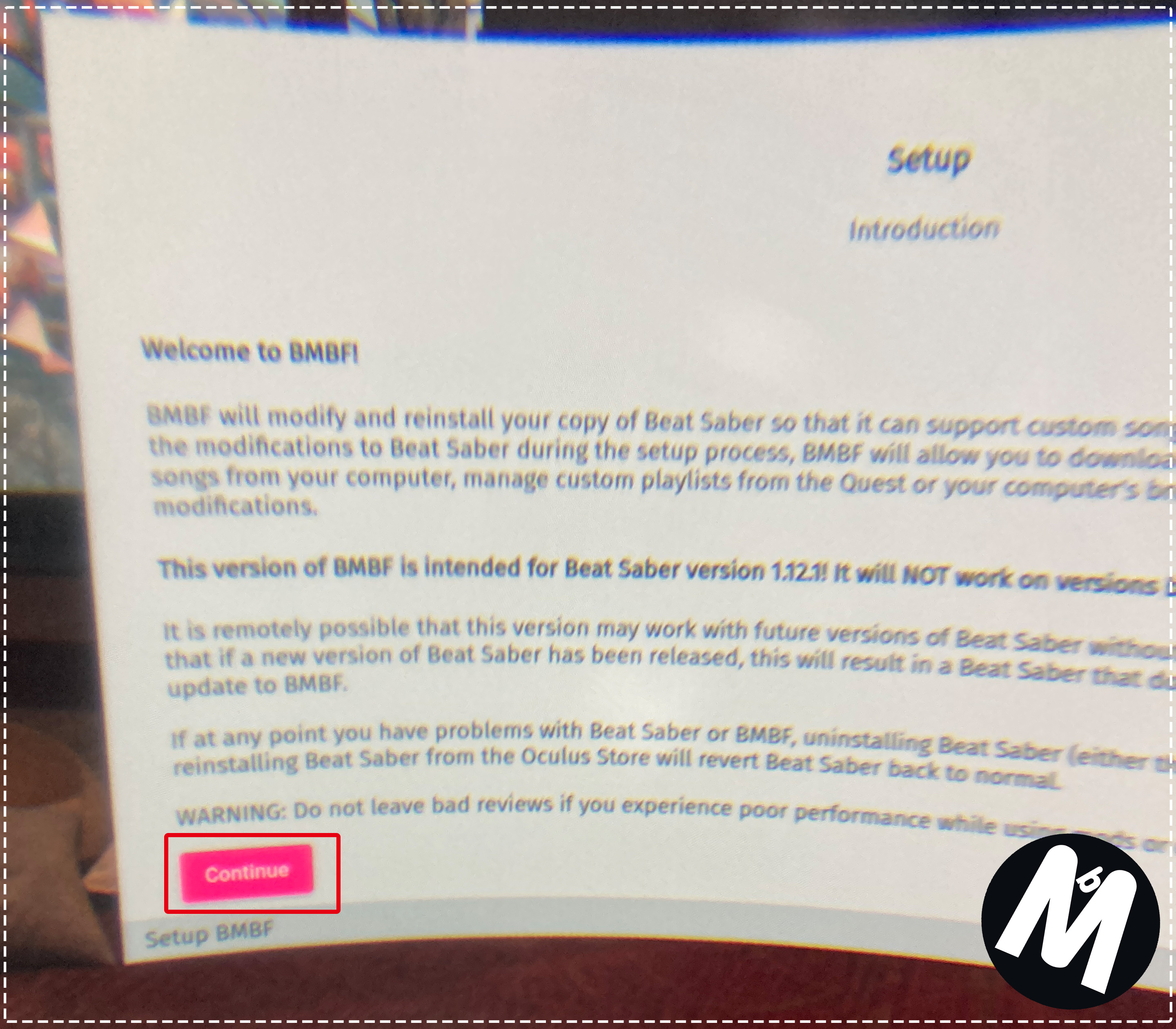 2) 실행시키면 친절하게 BMBF를 설치하기 위한 과정을 단계별로 안내해줍니다. 아래 Continue를 눌러 단계별로 하라는 대로 설치해 나가시면 됩니다. 현재 글쓰고 있는 시점에서는 비트세이버 1.21.1/1.21.2 버전을 기준으로 만들어진 BMBF로 설명하고 있으니 참고하시기 바랍니다.