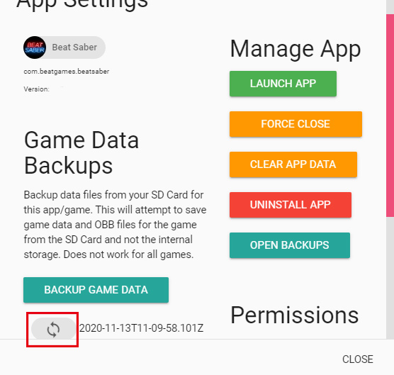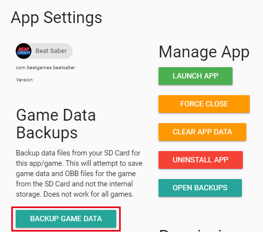 2) 위의 사진과 같이 BACKUP GAME DATA 부분을 클릭해서 데이터를 백업해 줍니다. 완료되었으면 오른쪽에 있는 UNINSTALL APP을 클릭하여 비트세이버 앱을 제거해줍니다.