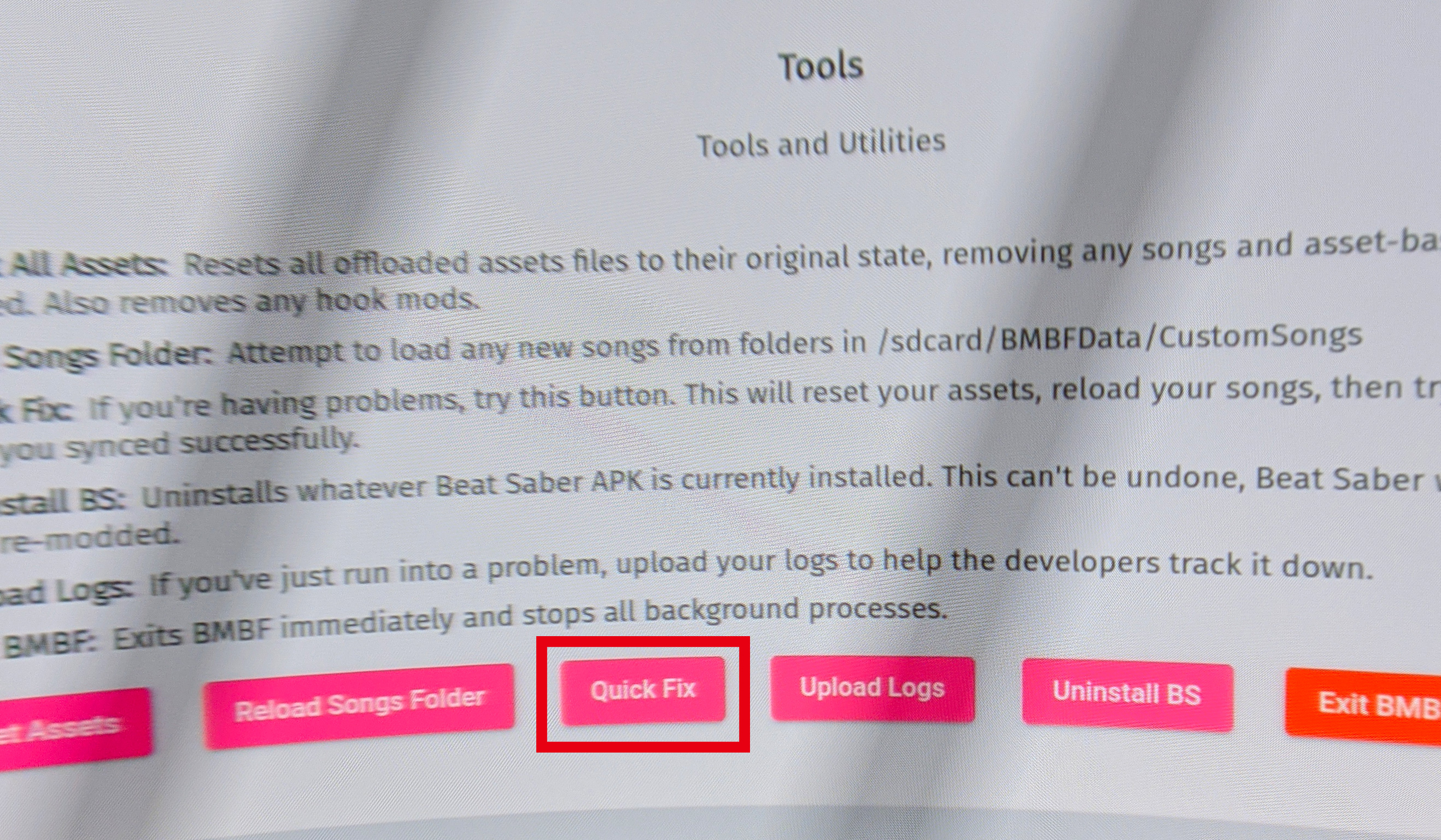 BMBF앱 - 상단 Tools - Quick Fix 버튼을 눌러주면 초기화후 다시 커스텀곡을 불러오는 과정을 거치게 됩니다. 진행바를 참고하셔서 과정이 완료되면 오른쪽 상단에 뜨는 Sync to Beat Saber 버튼을 눌러서 적용을 완료해주시면 됩니다.