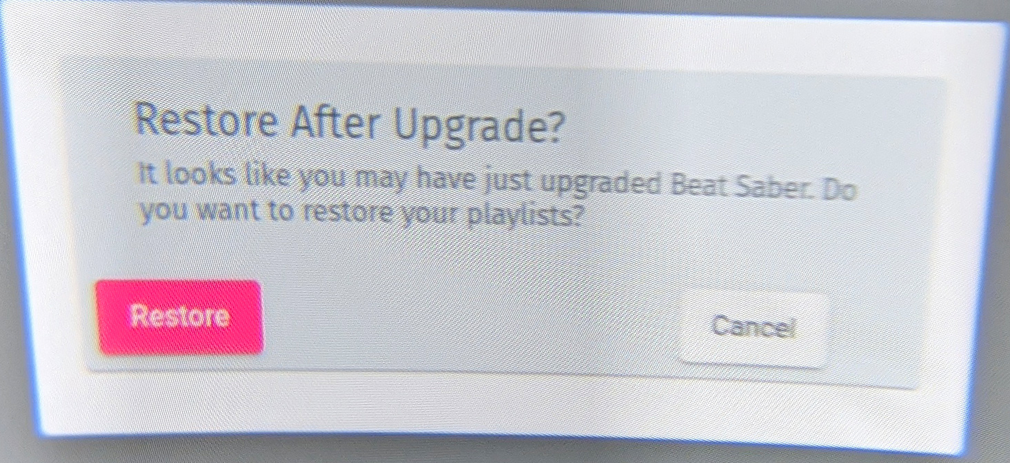 업데이트 이후 BMBF앱을 실행시키면 위와 같이 커스텀곡을 복구하겠냐는 창이 뜹니다. 여기서 당연히 Restore 버튼을 눌러 복구를 진행하시면 됩니다. 이때 오른쪽에 Sync to Beat Saber 버튼이 뜨게 되는데, 진행 바를 참고하셔서 복구가 다 되면 해당 버튼을 눌러주시면 됩니다.